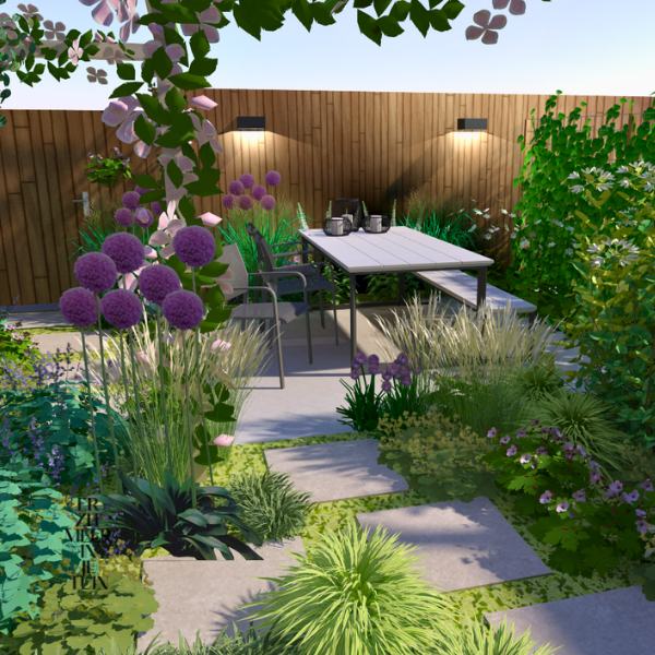 Grote tegels creëren een speels pad en zorgen voor een logische indeling, zonder dat de tuin kleiner oogt.