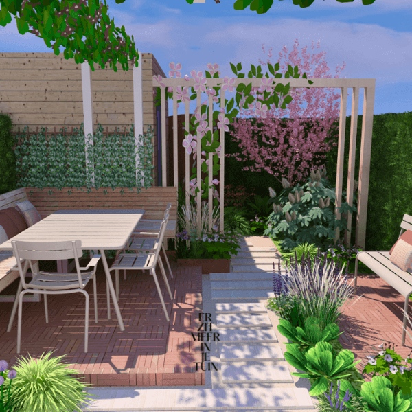Door een vaste eethoek en een logische looproute voelt de compacte tuin overzichtelijk en ruim.